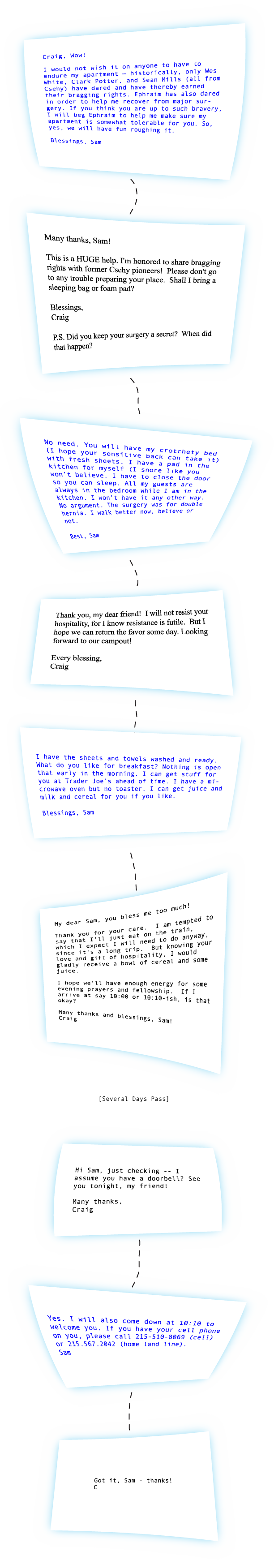 Across from the bookcase and the door to his bedroom stood the fridge – small and plastered with photos of friends, missionaries, various promotional and art-bearing magnets, and quotations by Christian writers scribed in Sam’s own hand.